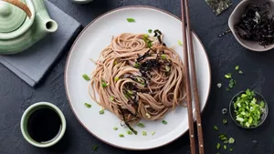 Les nouilles Soba de couleur marron grise sont une composante traditionnelle majeure de la cuisine japonaise, appelée également Washoku. Elles sont à base de farine de sarrasin et d’eau, ce qui leur donne un léger arôme de noisette très caractéristique. Elles sont parfois aussi verdâtres quand on leur ajoute du thé vert en poudre. Les nouilles Soba sont traditionnellement servies soit froides avec différents dips, soit sous forme de garniture dans les soupes de nouilles. Les bouillons sont la plupart du temps à base de bouillon de poisson (dashi) et de sauce soja. Comme pour les nouilles Udon, la garniture des plats de nouilles Soba dépend de la saison. Les accompagnements sont en général les mêmes que ceux des nouilles Udon. Une particularité: dans la plupart des régions du Japon, les nouilles Soba sont préparées traditionnellement à la Saint-Sylvestre (toshikoshi) car elles sont censées porter bonheur. C’est pourquoi, dans l’agglomération de Tokyo, on les partage souvent avec ses nouveaux voisins.