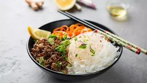 Les nouilles de riz asiatiques typiques sont faites à partir de farine de riz et d’eau. Pour les préparer, on ne les fait pas cuire à proprement parler, mais on se contente de les faire tremper dans de l’eau bouillante et de les laisser gonfler un certain temps, en fonction de leur taille et de leur épaisseur. Les nouilles de riz se servent en accompagnement de plats au wok, dans des salades ou dans des soupes. Elles font partie des ingrédients les plus utilisés de la cuisine de l’Asie orientale et sont en général idéales pour une alimentation sans gluten. Vivez-vous vous aussi sans gluten? Connaissez-vous déjà notre Sauce soja Tamari sans gluten?
