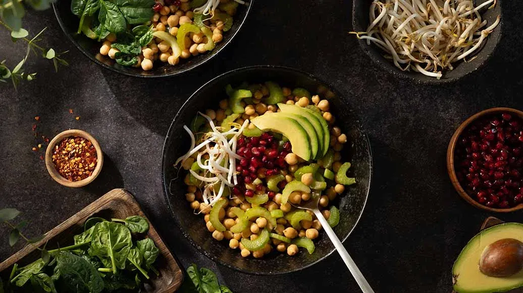 Un vrai concentré de protéines grâce aux légumineuses : pois chiches, tofu et pousses. Le tout enrichi en antioxydants, bonnes graisses et chlorophylle, avec des graines de grenade, de l’avocat et des feuilles d’épinard.