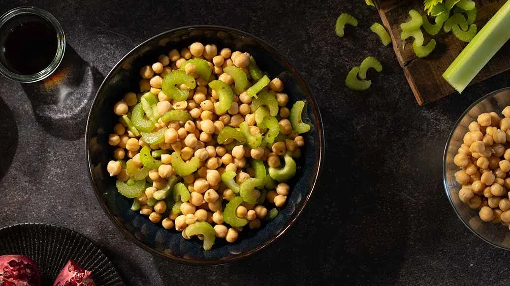 Égoutter les pois chiches (conserver le liquide de cuisson, appelé aquafaba, pour préparer des soupes ou d'autres plats). Mélanger les pois chiches et le céleri dans un saladier avec la sauce Teriyaki au sésame Kikkoman et la sauce Ponzu au citron Kikkoman.
