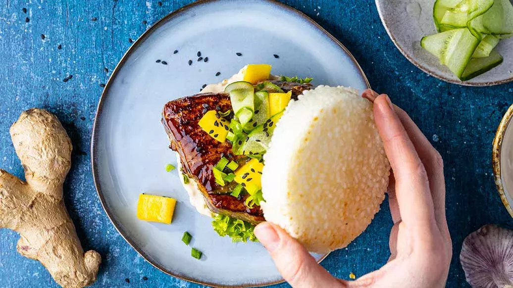 Échangez vos deux tranches de pain contre un bun au riz ! Et pour aller avec : découvrez notre recette de steak de thon, mariné dans de l’ail, du citron, du gingembre et du citron vert. En accompagnement, vous avez le choix : de la laitue croustillante, de la mangue et du concombre. Idéal pour celles et ceux qui ne savent jamais choisir entre sushis et burgers.