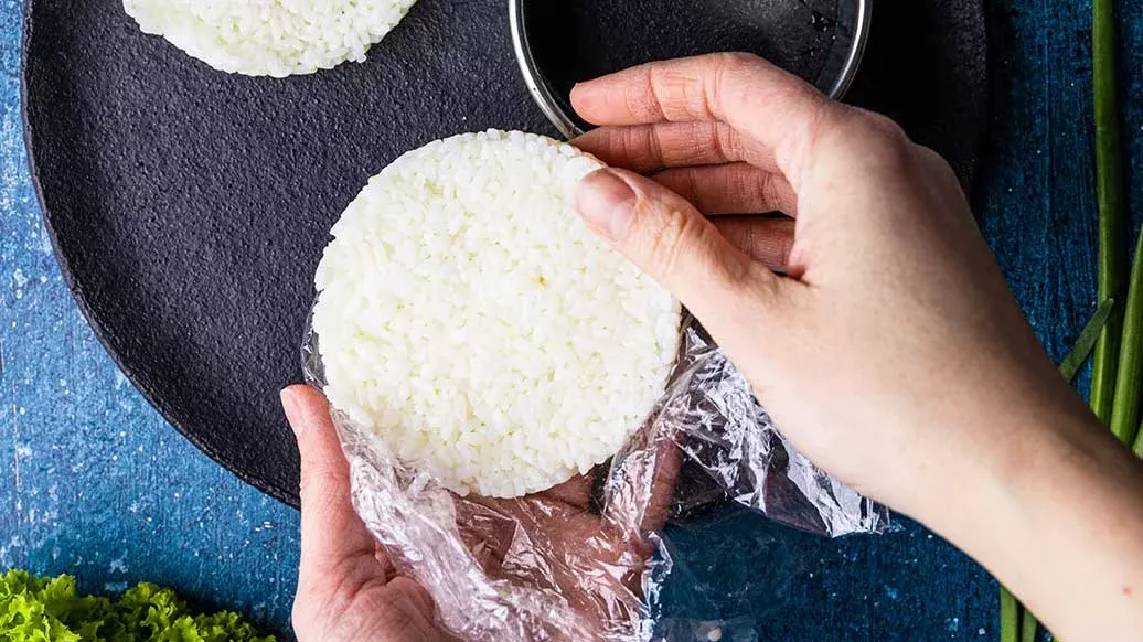 Tapisser un moule rond de film plastique, d'environ 12 cm de diamètre. Placer ¼ du riz à sushi cuit à l'intérieur et appuyer fermement. Le retirer soigneusement avec le film plastique, l’envelopper et le mettre de côté. Faire trois autres galettes avec le reste du riz et réfrigérer pendant environ 30 minutes.