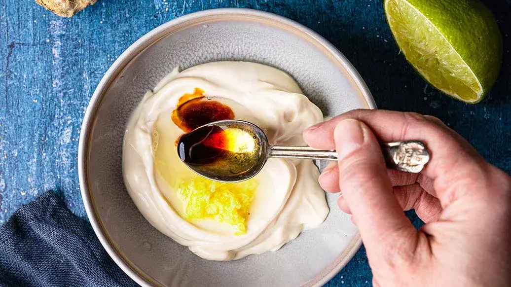 Mélanger la mayonnaise avec le gingembre râpé, le jus de citron vert et la sauce soja Kikkoman allégée en sel.