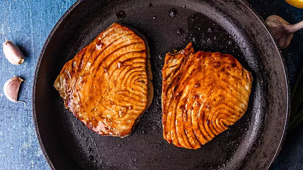 2 steaks de thon, d'environ 200 g chacun – 4 càs Sauce soja à teneur en sel réduite fermentation naturelle Kikkoman – 2 càs Huile de sésame grillée Kikkoman – 1 càs de miel – 1 càs de jus de citron – 1 gousse d'ail – ½ càc de poivre