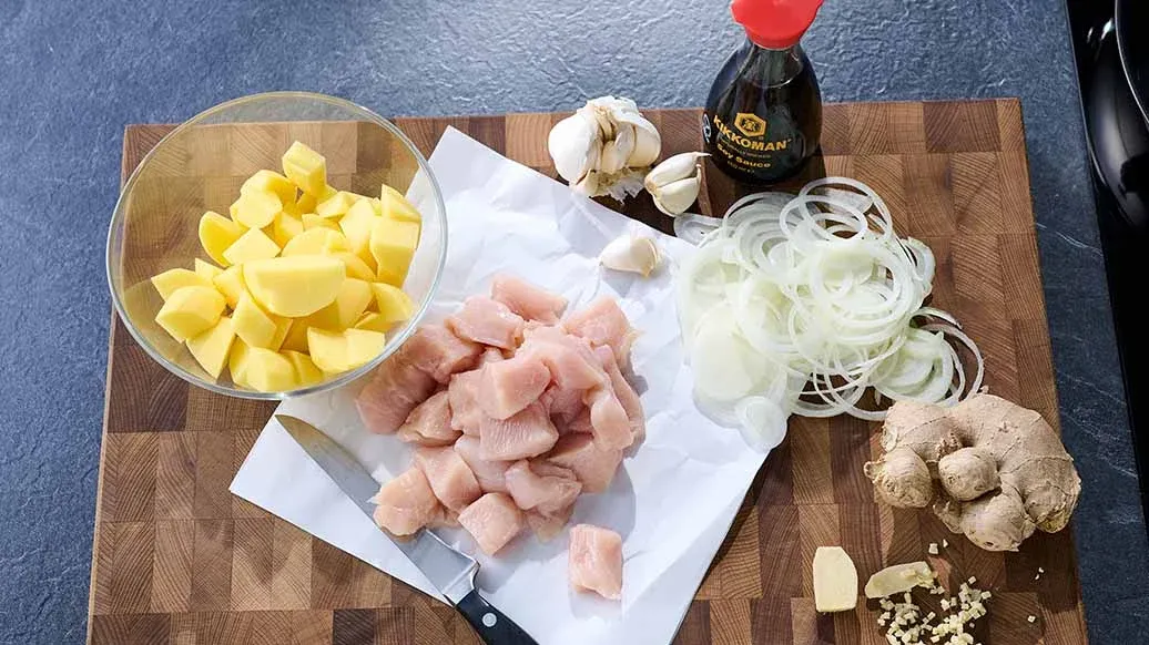 Sécher le filet de poulet et le couper en morceaux d’environ 2 cm. Éplucher, laver et couper les pommes de terre en gros dés. Émincer finement l’oignon en rondelles. Hacher finement le gingembre et l’ail.