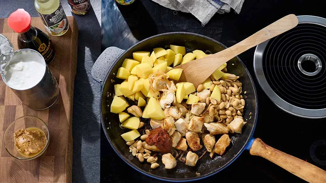 Faire revenir le poulet dans l’huile de sésame grillé Kikkoman bien chaude. Ajouter l’oignon, le gingembre et l’ail, puis les faire revenir brièvement. Ajouter ensuite les pommes de terre, les cacahuètes et la pâte de curry, mélanger rapidement, puis déglacer avec le lait de coco. Ajouter la pâte d’arachide (ou le beurre de cacahuète), le sucre, la sauce Ponzu citronnée Kikkoman et la sauce soja Kikkoman. Laisser mijoter pendant environ 20 minutes. Si la sauce devient trop épaisse, ajouter un peu d’eau