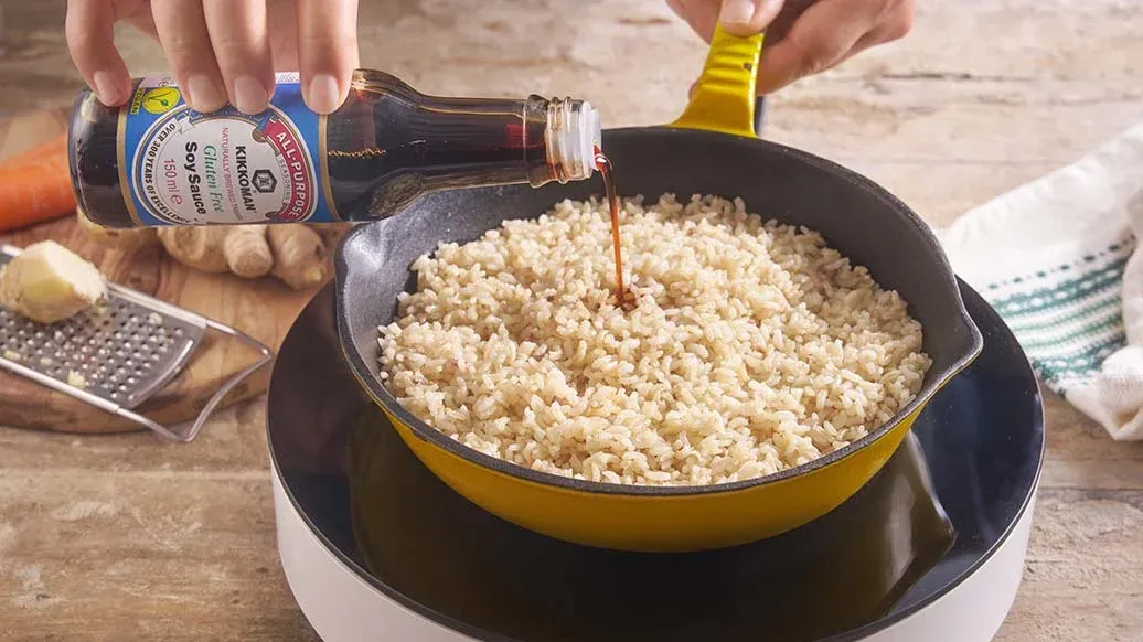 Cuire le riz selon les instructions figurant sur l'emballage. Faire fondre le ghee dans une poêle et faire revenir l'échalote et l'ail pendant 1 minute. Ajouter le riz et faire revenir pendant 2 minutes supplémentaires. Assaisonner avec la sauce soja sans gluten Kikkoman. Garnir le dal avec le piment émincé et servir avec le riz.