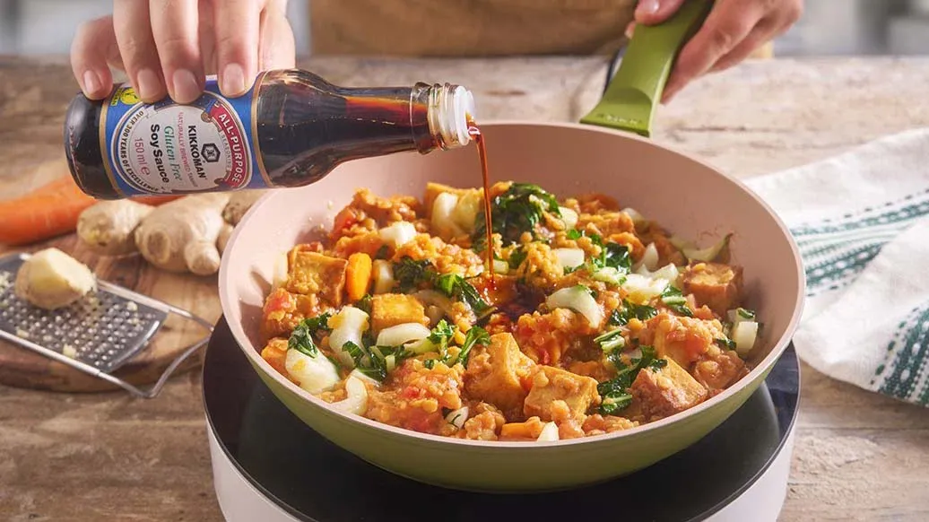 Dal crémeux aux lentilles rouges avec gingembre et tofu croustillant, assaisonné de masala et de sauce soja sans gluten Kikkoman. Servi avec un riz frit parfumé à l'ail et à l'échalote.