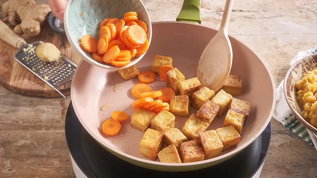 Faire cuire les lentilles dans le bouillon de légumes pendant 10 minutes. Dans une poêle, faire revenir le tofu dans le ghee pendant environ 4 à 5 minutes jusqu'à ce qu'il soit croustillant. Ajouter les carottes et le gingembre et faire revenir pendant 2 minutes.