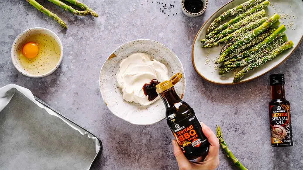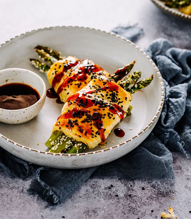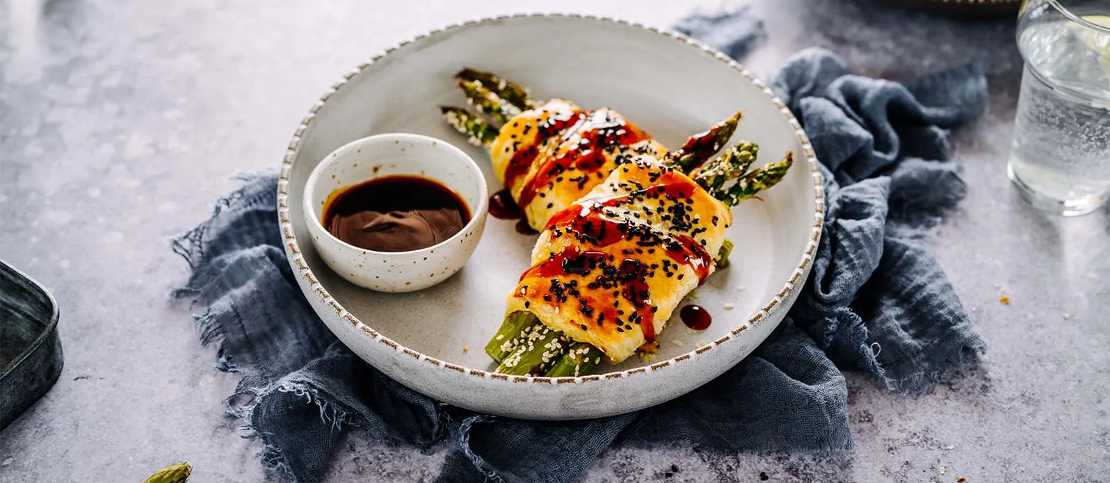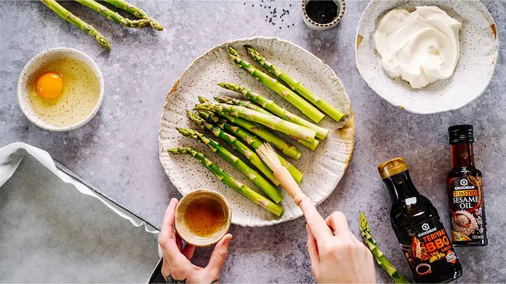 Des asperges vertes enveloppées de fromage frais et d'une pâte feuilletée croustillante. Les graines de sésame et la sauce Teriyaki BBQ au miel Kikkoman, à la fois douce et savoureuse, apportent de la profondeur. Un plat simple, de saison et très réconfortant.