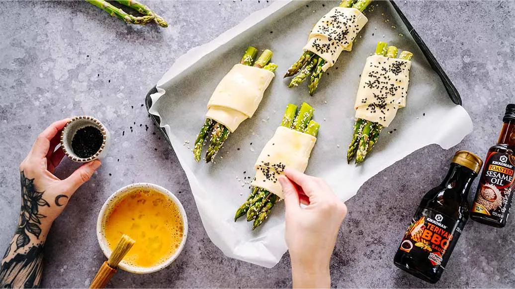 Disposer les asperges enrobées sur une plaque de cuisson recouverte de papier sulfurisé. Badigeonner avec l'oeuf battu et saupoudrer de graines de sésame noir. Faire cuire pendant 20 minutes à 200 °C. Servir avec la Sauce Teriyaki BBQ au Miel Kikkoman.