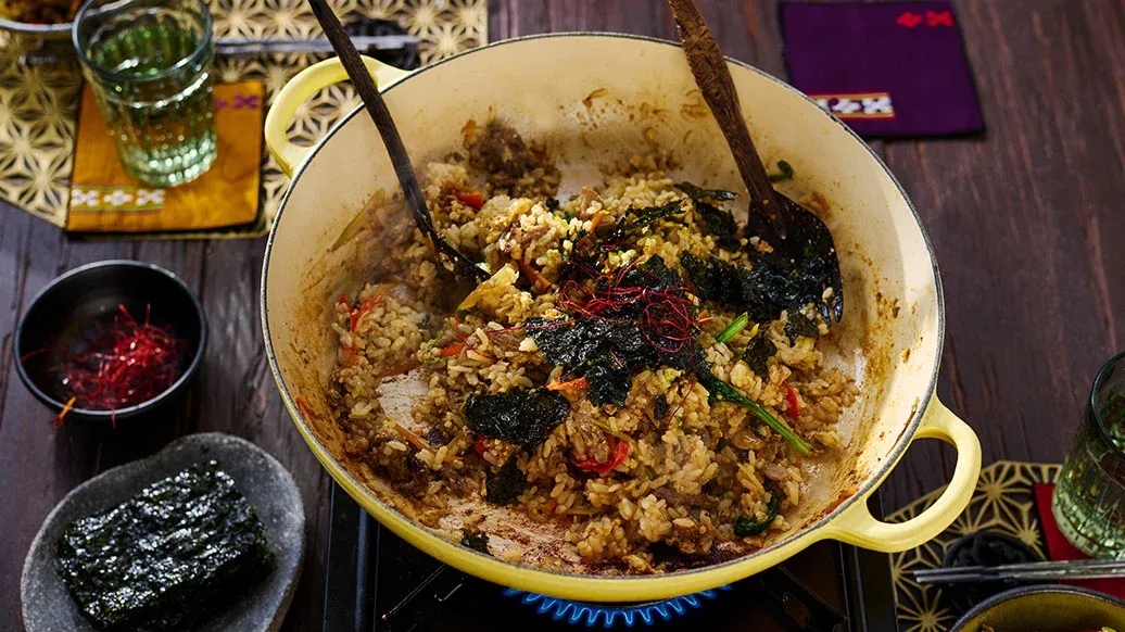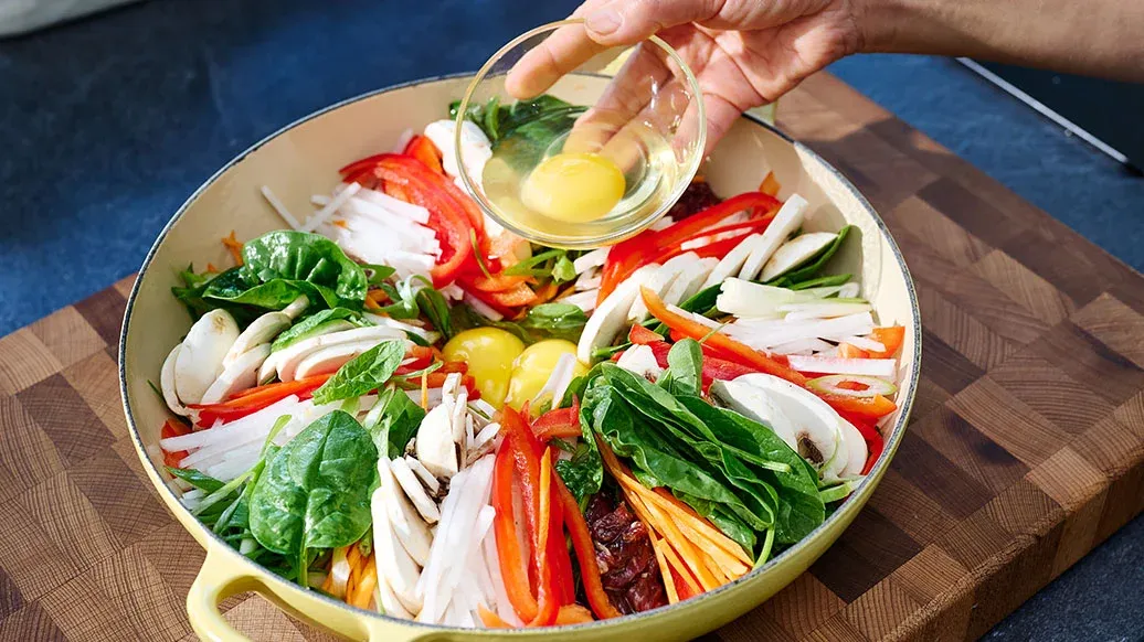 Casser les œufs dans l'espace au centre de la casserole. Placer la casserole sur feu moyen et verser l'eau uniformément autour des ingrédients. Lorsque les œufs et les légumes sont cuits, mélanger délicatement et servir avec le riz.