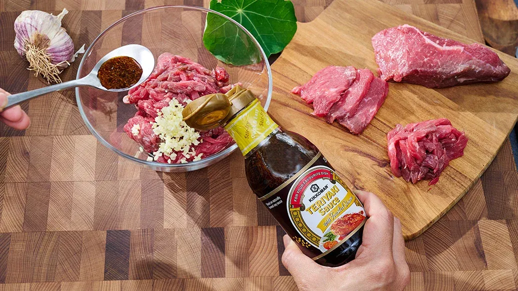 300 g de fines tranches de bœuf ou de porc (le bœuf haché ou le tofu conviennent également) – 1 gousse d'ail râpée – 120 ml Sauce Teriyaki au sésame grillé Kikkoman