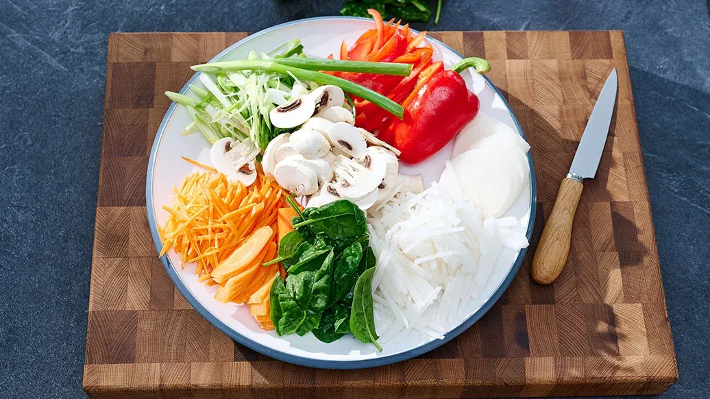 Couper le daikon et la carotte en julienne en fines lamelles de 6 cm de long. Couper les oignons nouveaux, les épinards et le poivron rouge en morceaux de 6 cm de long. Couper les champignons en tranches de 5 mm d'épaisseur.