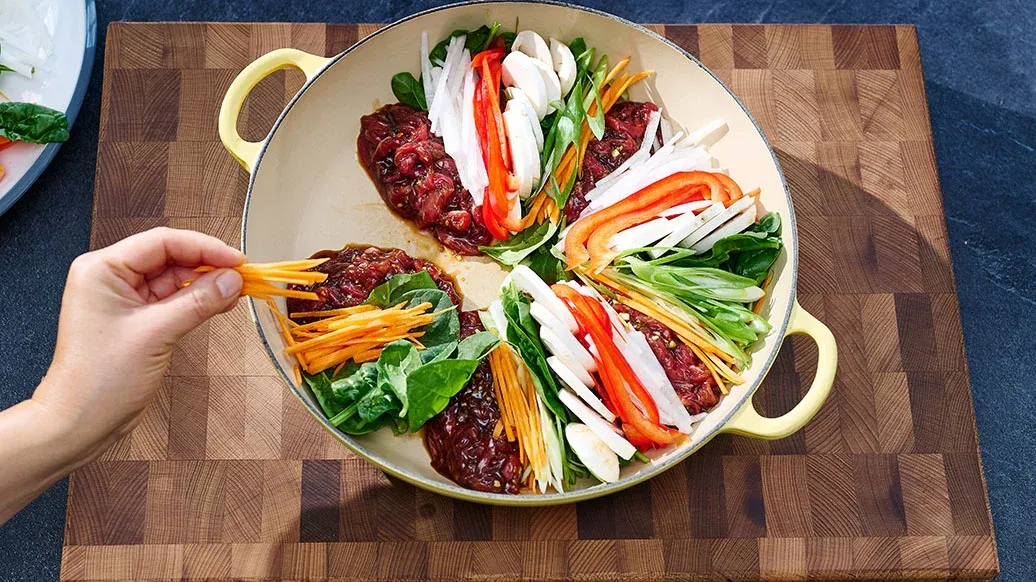 Faire chauffer l'huile de sésame Kikkoman dans une casserole. Diviser la viande marinée à l’étape 1 en 5 portions et les disposer en cercle en laissant un espace entre chacune. Répartir les légumes de l’étape 2 de manière uniforme autour de la viande en suivant le même motif circulaire.