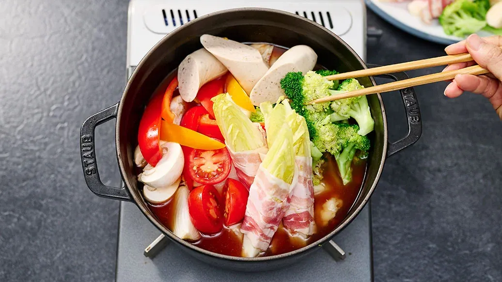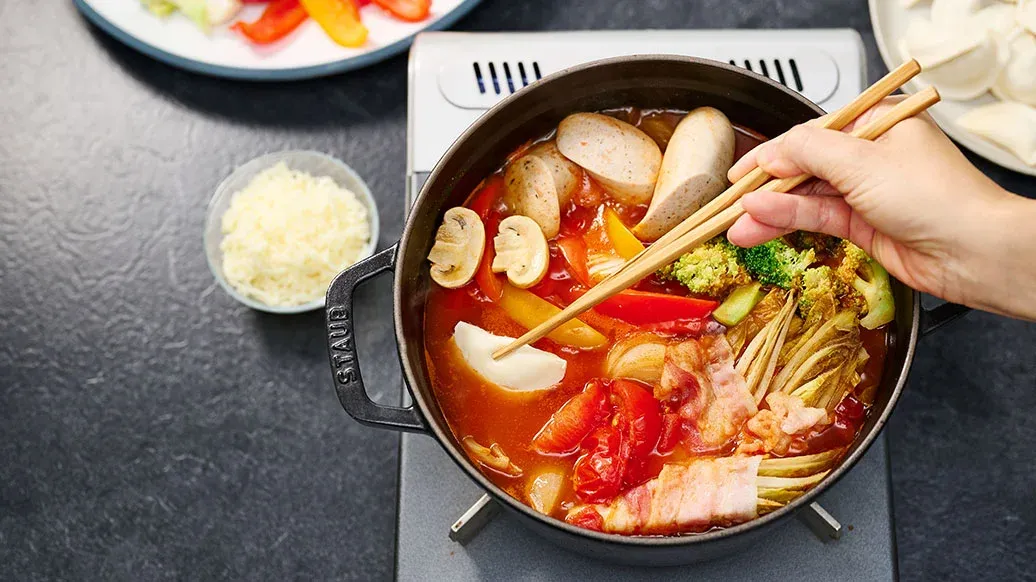 Un plat simple avec des ingrédients occidentaux, relevé par le piquant de la sauce chili épicée pour Kimchi Kikkoman. Le bacon fumé, les saucisses et le fromage fondant apportent une touche d’umami riche. Rapide à préparer à table et parfait à partager.