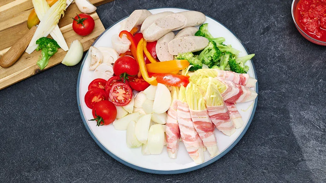 Couper les endives en quatre dans la longueur et enrouler chaque morceau d’une tranche de bacon. Détailler le brocoli en petits bouquets. Couper l’oignon et les tomates en huit quartiers. Émincer le poivron rouge en lanières. Nettoyer les champignons : couper les plus gros (de Paris ou pleurotes royaux) en deux et séparer les champignons enoki en petits paquets. Couper les saucisses en deux.