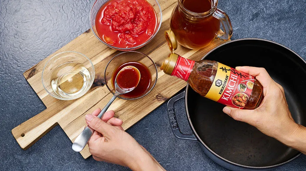 500 ml de bouillon de volaille – 400 g de tomates concassées en boîte – 50 ml de vin blanc – 4 càs Sauce chili épicée pour Kimchi Kikkoman