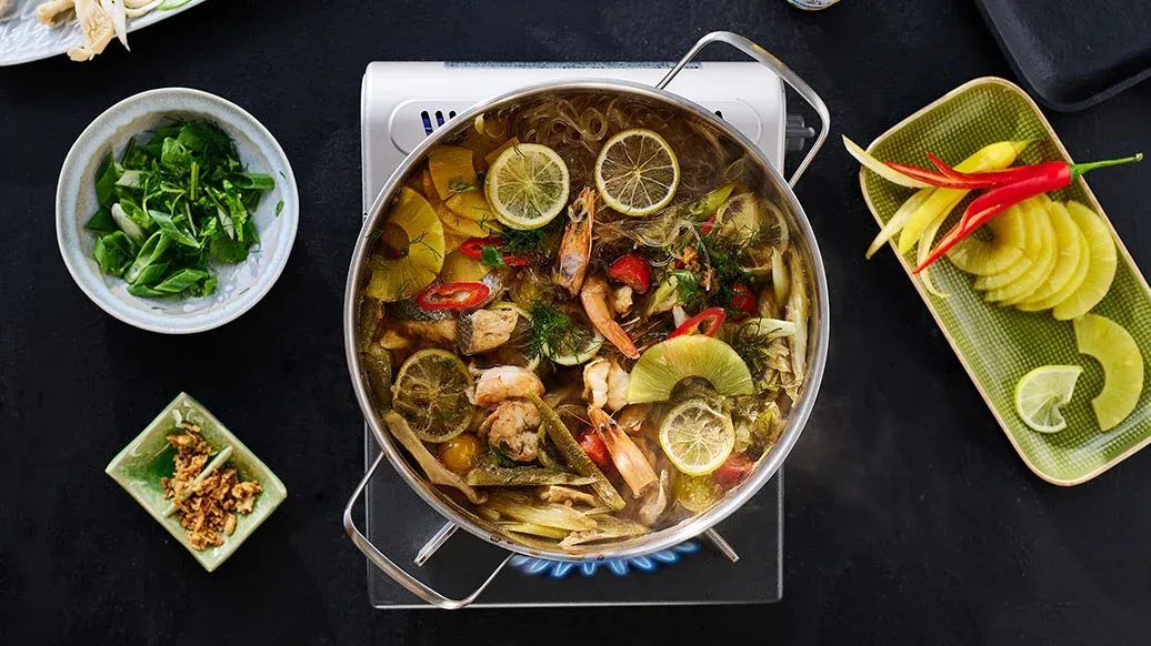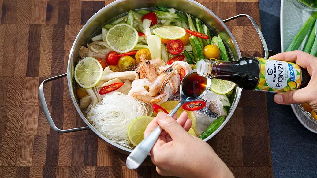 Un bouillon aigre-doux inspiré du canh chua, à base de poisson, d’herbes, de fruits de mer, de légumes, d’ananas et de tomates. Rehaussé avec la sauce soja citronnée Ponzu Kikkoman, il est léger, aromatique et parfait à partager à table.