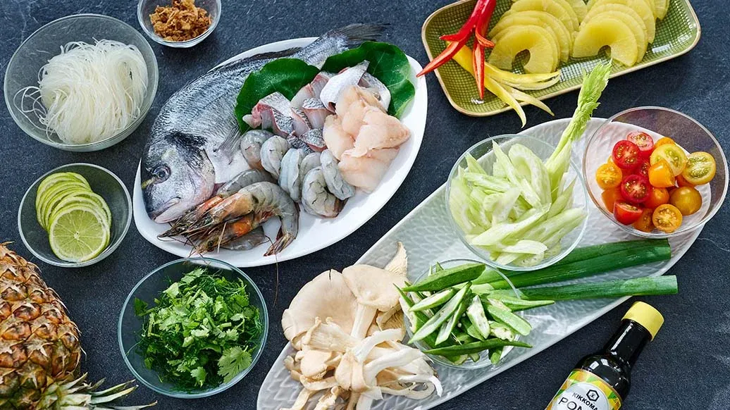 300 g de filet de poisson blanc – 8 crevettes – 250 g d’ananas – ½ citron vert ou ½ citron jaune – 200 g de céleri – 12 gombos (okras) – 8 petites tomates – 200 g de champignons (enoki, pleurotes royaux ou shiitakés) – 80 g d’aneth – 80 g de coriandre – 80 g d’oignons nouveaux – 40 g de nouilles de verre