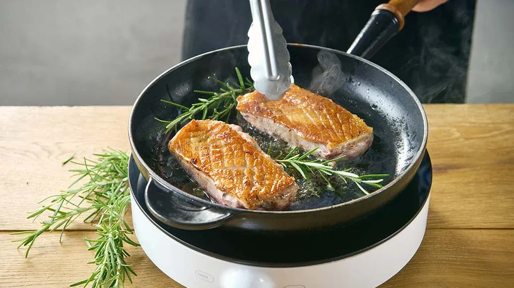 Entailler le magret de canard à l'aide d'un couteau en formant un quadrillage. La placer dans une poêle, côté peau vers le bas, et faire frémir à feu vif pendant environ 5 minutes de chaque côté, jusqu'à ce que la graisse de la peau soit fondue et que le canard soit doré. Ajouter les branches de romarin. Mettre le magret de canard dans un four préchauffé à 160 °C et faire cuire pendant environ 10-15 minutes, en fonction de la taille du magret de canard.