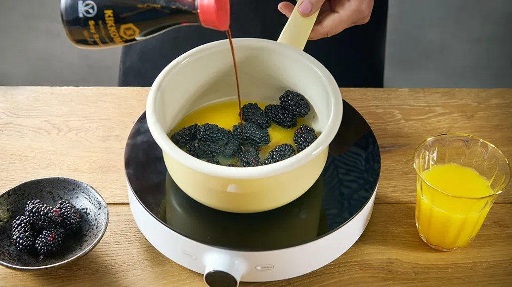 120 g de mûres – 100 ml de jus d'orange – 30 g de miel – 30 ml Sauce soja fermentation naturelle Kikkoman – 30 ml de vinaigre de cidre