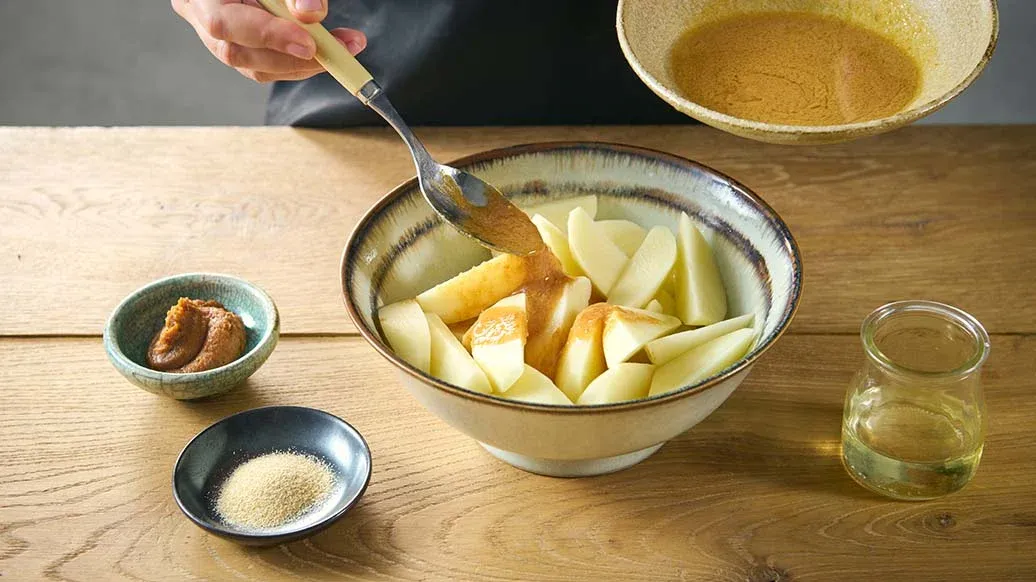 Couper les pommes de terre en quartiers et les mélanger avec la pâte de miso, l'ail et l'huile. Faire cuire au four à 180 °C pendant environ 40 minutes.