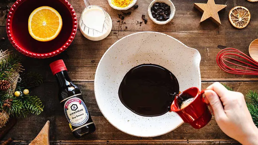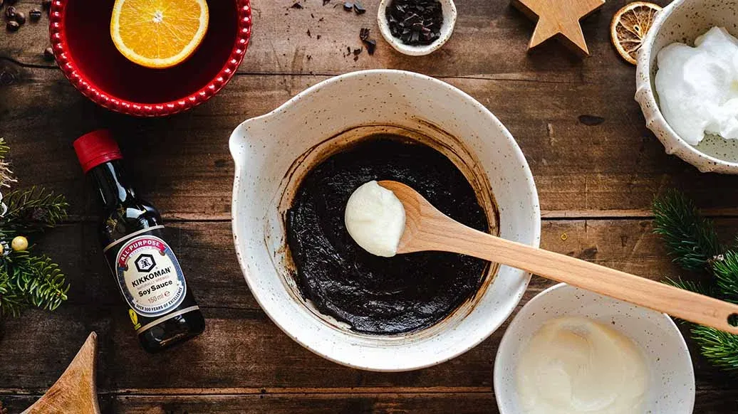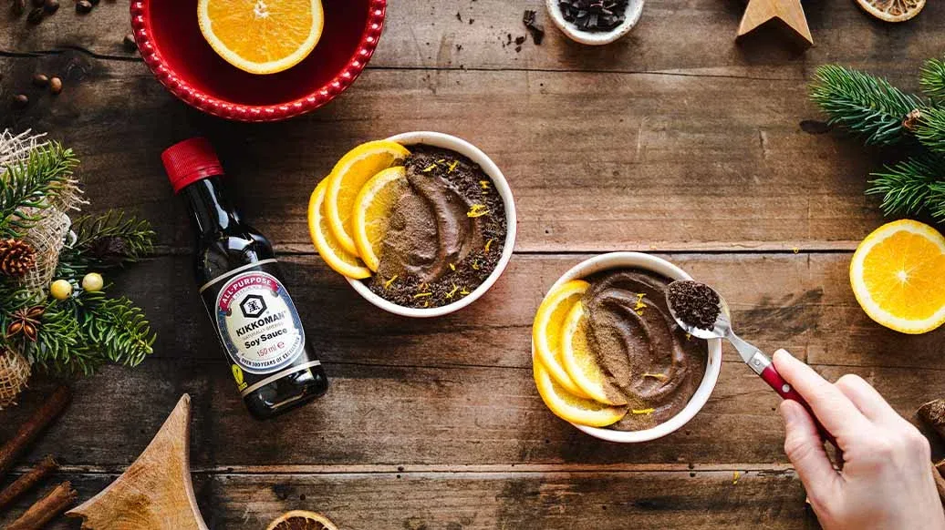 Une mousse au chocolat aérienne, préparée avec de l’espresso et la sauce soja Kikkoman pour une touche d’originalité.