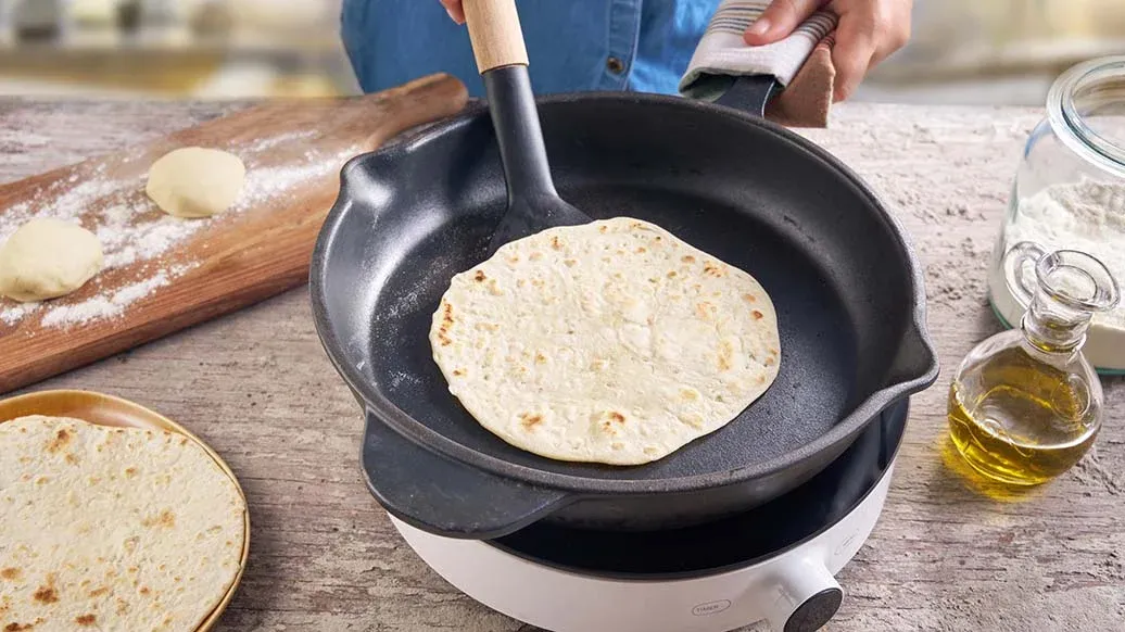 2 gousses d'ail finement hachées – 2 càs d'huile d'olive – 80 ml d'eau tiède – 150 g de farine de blé – 20 g de farine supplémentaire pour saupoudrer