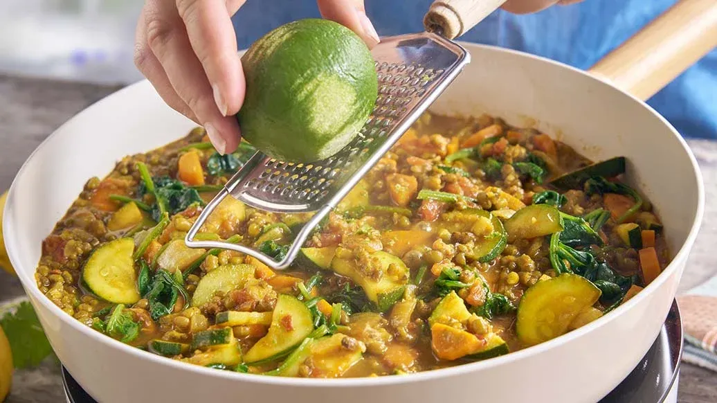 Un dal aromatique aux épinards, carottes et tomates, avec un duo de citron et citron vert. La sauce soja Kikkoman allégée en sel et la coriandre terminent de parfumer le tout.