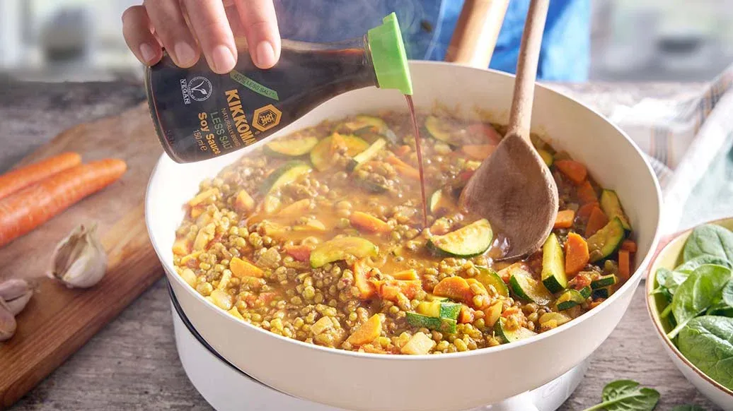 Faire cuire les haricots mungo dans le bouillon de légumes pendant 35 à 40 minutes. Émincer la carotte et la courgette. Faire revenir l'oignon, l'ail, la carotte et la courgette dans le ghee pendant 3 à 4 minutes. Ajouter le cumin, le curcuma, la cannelle et le piment et faire revenir pendant 10 à 15 secondes pour libérer les arômes. Incorporer les haricots cuits, puis ajouter les tomates en conserve et assaisonner avec la sauce soja Kikkoman à teneur réduite en sel. Laisser mijoter pendant 5 minutes, puis ajouter les épinards et laisser cuire pendant 1 minute.