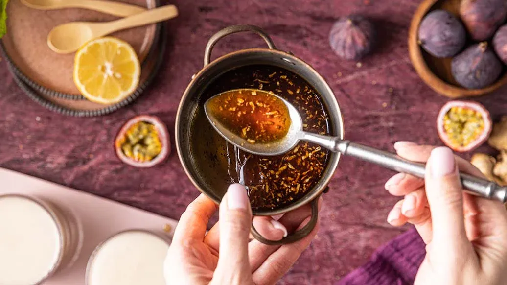 2 càs de sirop d'érable – ½ Tamari sauce soja sans gluten fermentation naturelle Kikkoman – 1 càc de gingembre fraîchement râpé – 1 càc de jus de citron – 2 figues – 1 fruit de la passion – 1 càc de copeaux de noix de coco – Feuilles de menthe pour la décoration