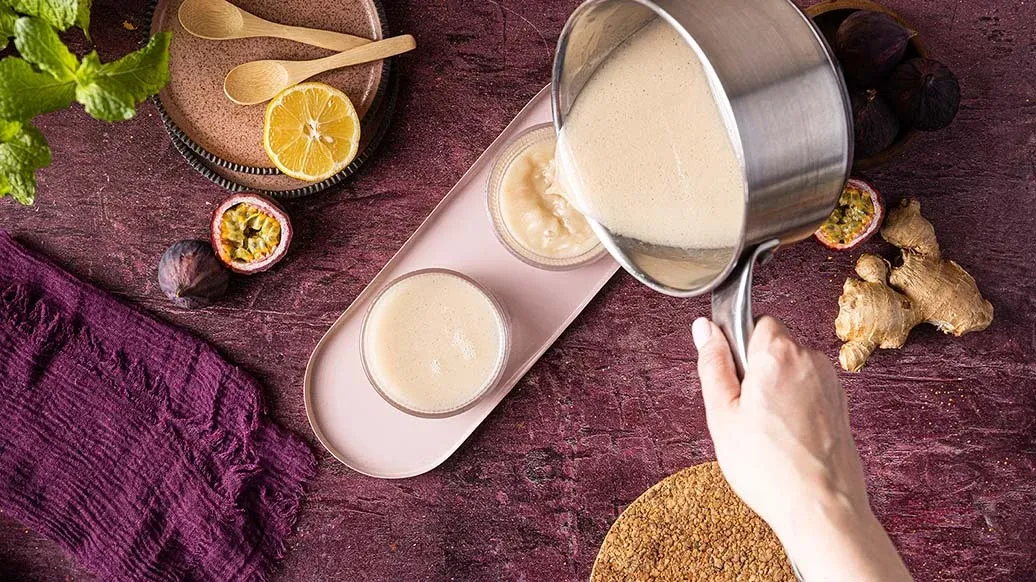 Panna cotta onctueuse au lait de coco, servie avec un sirop doux au gingembre et à la sauce soja. La sauce soja sans gluten Kikkoman apporte une profondeur umami subtile, équilibre la douceur du coco et révèle les notes exotiques du dessert avec une touche élégante et raffinée.