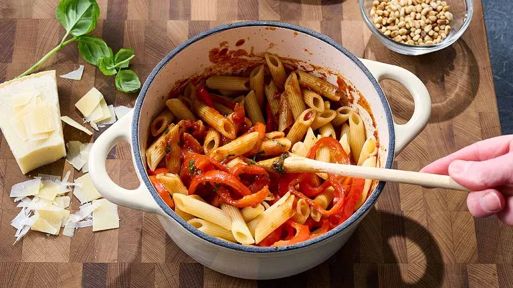 La rencontre d’un plat typiquement italien et de condiments asiatiques. Essayez notre recette de penne arrabiata avec une sauce au Kimchi et à la sauce soja. À servir avec du parmesan et des pignons de pin.