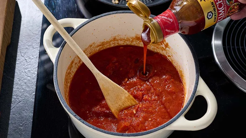 2 gousses d'ail – 3 càs de concentré de tomates – 1 càs d'huile d'olive – 2 càc Sauce chili épicée pour Kimchi Kikkoman – 600 g de tomates concassées (en conserve) – 1 càc brown sugar (or Kikkoman Mirin-Style Sweet Seasoning) – 40 g de pignons de pin