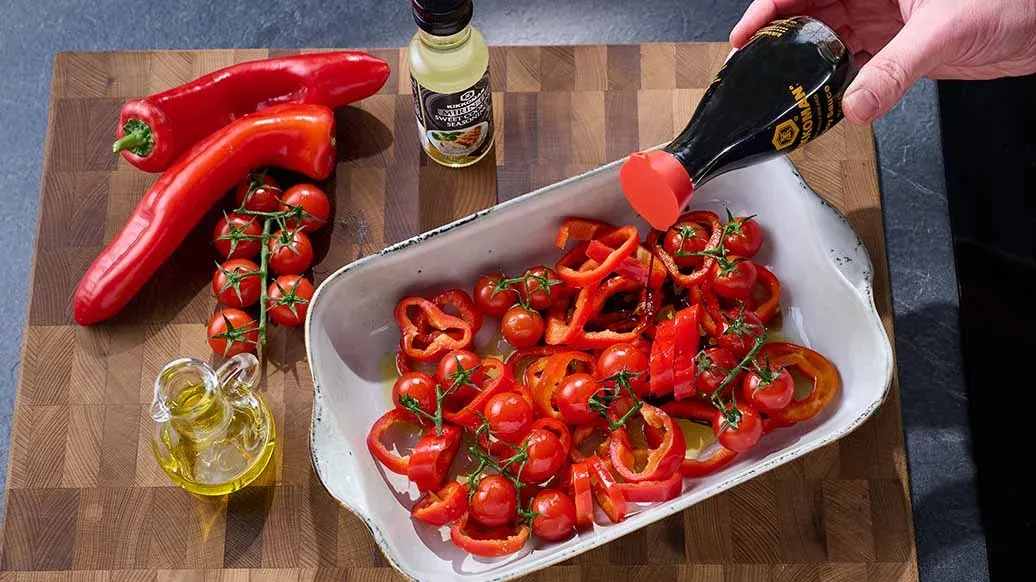 Préchauffer le four à 200°C. Couper les poivrons rouges en rondelles. Mélanger avec les tomates, l'huile, le sucre et la sauce soja Kikkoman. Étaler dans un petit plat allant au four et rôtir dans le four préchauffé pendant 10 à 15 minutes, jusqu'à ce que les tomates commencent à éclater.