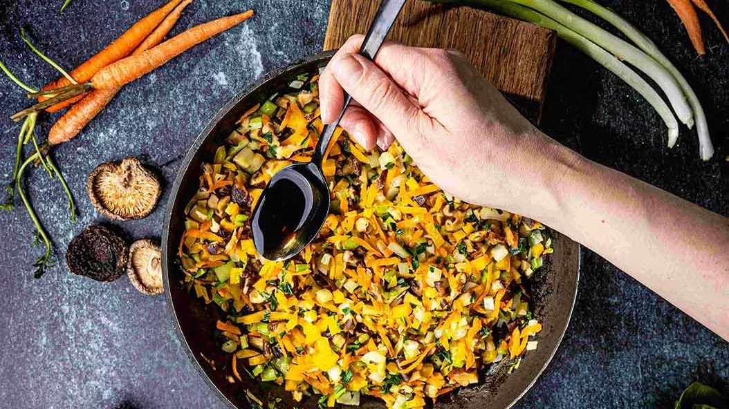 Faire tremper les champignons dans de l'eau chaude et laisser reposer pendant 15 minutes. Hacher ensuite le pak choi. Râper la carotte avec une râpe large et hacher finement le poivron et l'ail. Faire sauter les légumes dans l'huile de sésame Kikkoman, puis ajouter les champignons hachés et la sauce soja Kikkoman. Faire frire pendant quelques minutes, en remuant constamment, jusqu'à ce que les légumes soient tendres. Réserver le temps qu’ils refroidissent.