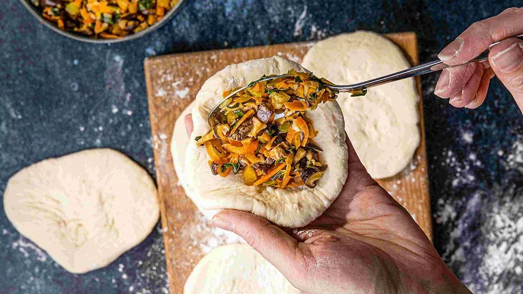 Diviser la pâte préparée à l'étape 1 en 6 parts égales et former une petite boule pour chacune d’elles. Étaler comme un disque plat. Placer la farce de l'étape 2 sur chaque disque et sceller les bords pour former une poche.