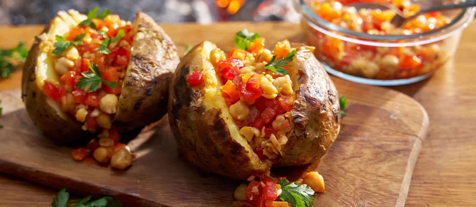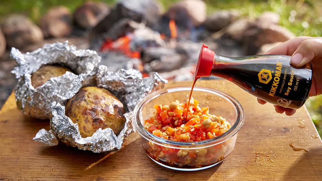 Une délicieuse recette de pommes de terre cuites à la braise, aux légères notes fumées, garnies d’une salsa de poivrons rouges rôtis, d’ail et de pois chiches, et relevées d’une touche de sauce soja Kikkoman.