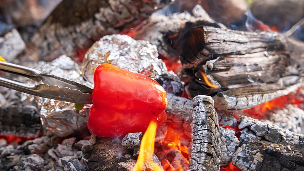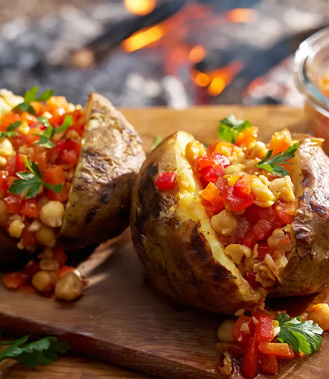 Arroser les pommes de terre d'huile de colza, les envelopper dans du papier aluminium et les enfouir dans les braises du feu de camp pendant environ 40 minutes.