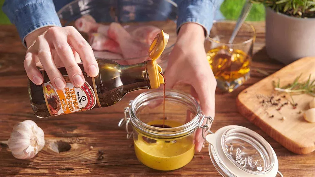 3 gousses d'ail – 3 càs de moutarde de table – 4 càs Sauce barbecue Teriyaki au miel Kikkoman – ½ càs miel (ou de sucre brun) – 4 càs whisky – 1 pincée de poivre