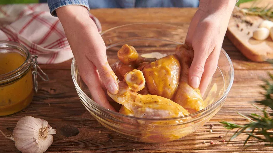 Enrober soigneusement les pilons de poulet avec la marinade préparée et placer au réfrigérateur pendant au moins 2 heures.