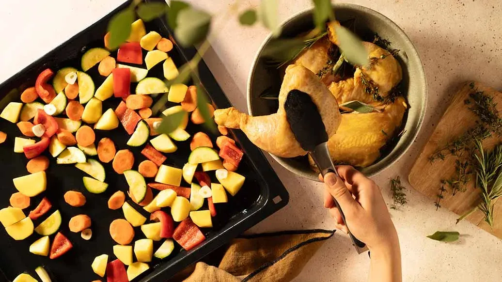 Dans un bol, mélanger les pommes de terre, les carottes, les courgettes et les poivrons avec un peu d'huile d'olive, du sel et du poivre. Étaler sur une plaque de cuisson. Disposer le poulet mariné sur le dessus et verser le reste de la marinade.