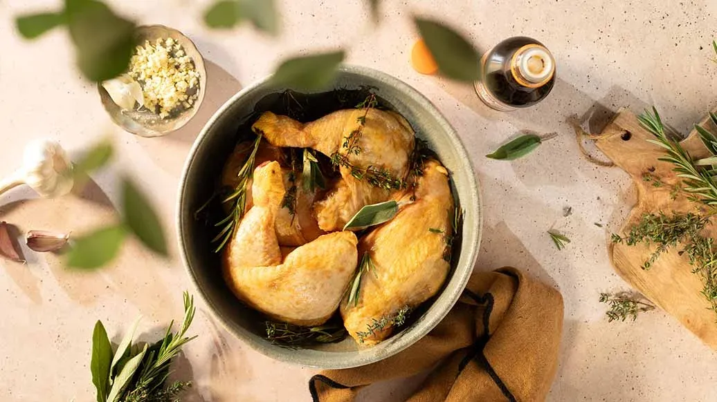 Un poulet mariné dans de la sauce soja et des herbes de provence, puis fourré à l’ail et servi avec des légumes. Pour un équilibre parfait entre saveurs sucrées et herbes aromatiques.