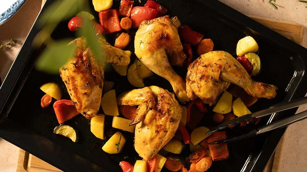 Cuire au four préchauffé à 190 °C pendant 45-50 minutes, jusqu'à ce que le poulet soit bien cuit et les légumes tendres et légèrement dorés. Servir chaud.