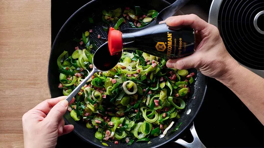 Couper les poireaux en rondelles. Faire revenir les lardons dans une poêle antiadhésive. Ajouter les poireaux et faire revenir le tout pendant environ 10 minutes. Assaisonner avec la sauce soja Kikkoman.
