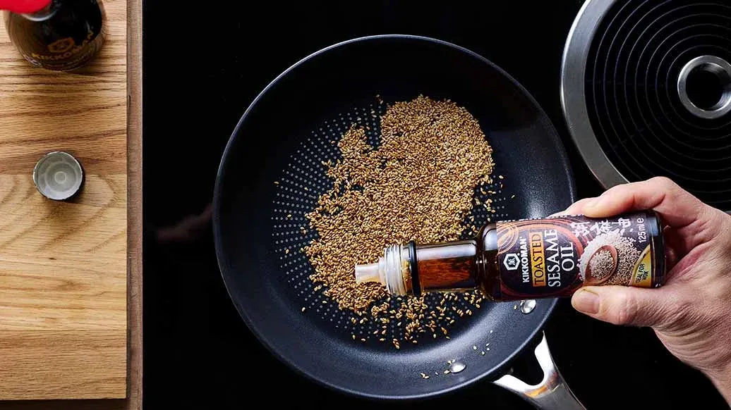 2 càs de graines de sésame – 2 càs Huile de sésame grillée Kikkoman – 2 càs Sauce soja fermentation naturelle Kikkoman