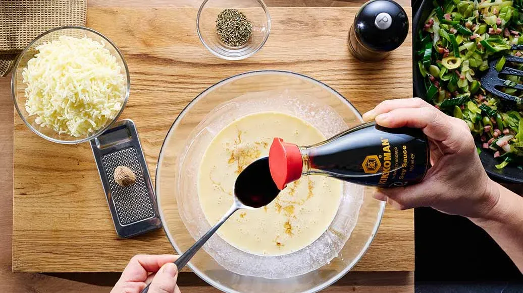 Une tarte gourmande qui revisite un classique français : poireau, lard fumé et thym s’associent aux œufs, à la crème et à la sauce soja Kikkoman. À déguster chaude ou froide.