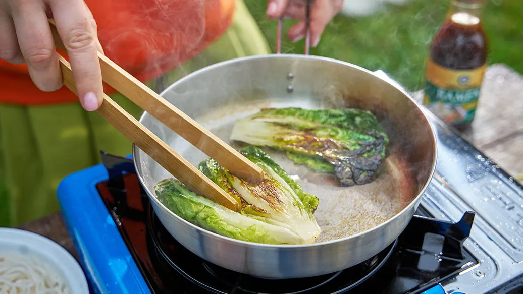 Couper la laitue romaine en deux et la faire revenir pendant 2 à 3 minutes dans l'huile de colza. Faire cuire les nouilles ramen séparément dans de l'eau bouillante selon les instructions figurant sur l'emballage, puis les égoutter.