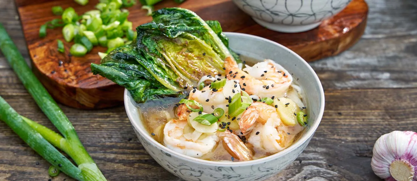 Ramen aux crevettes et laitue romaine